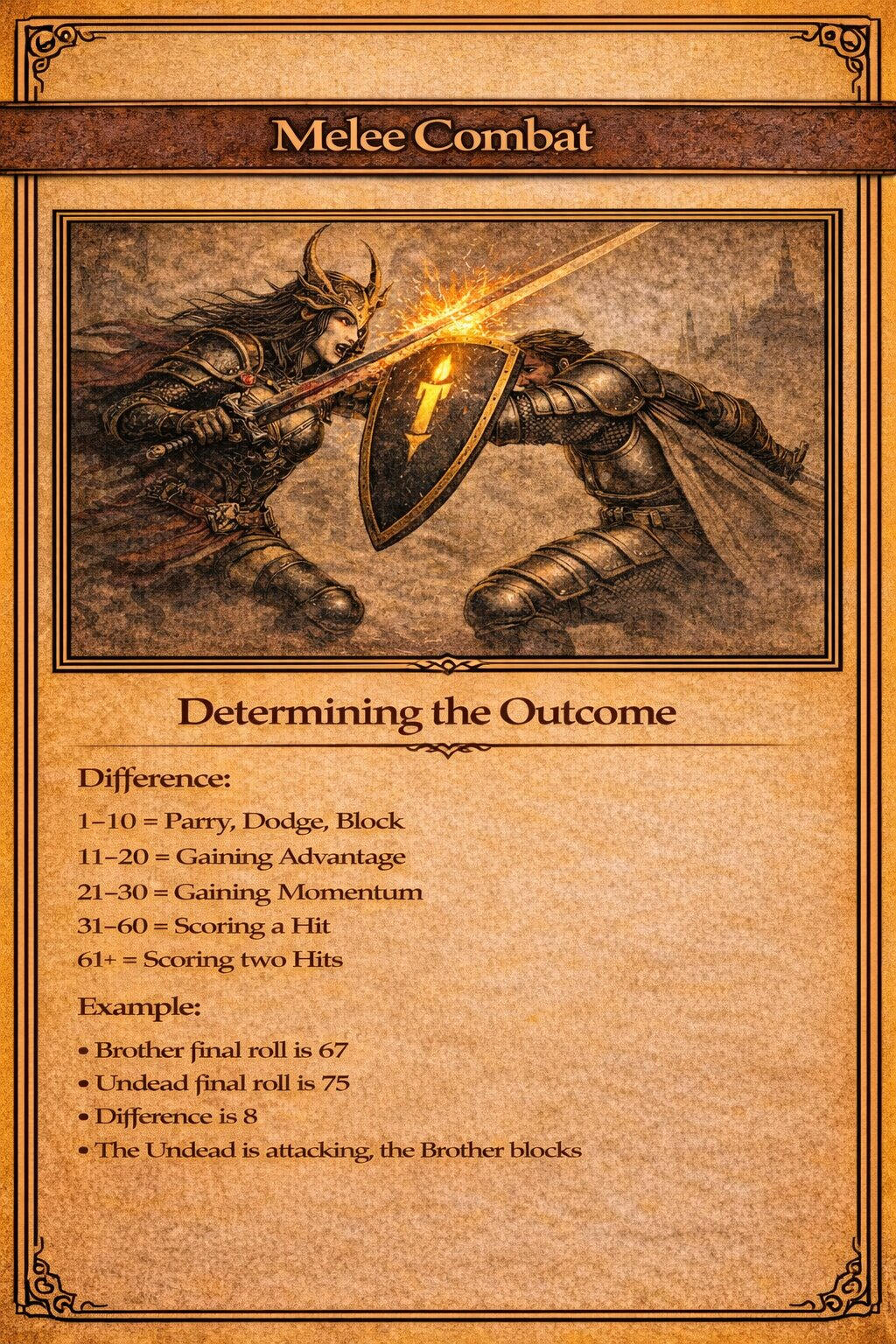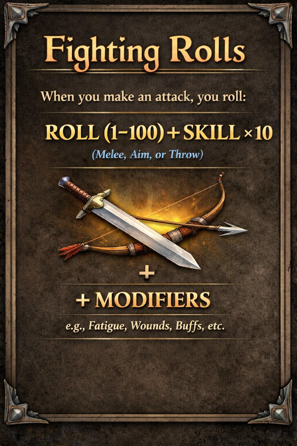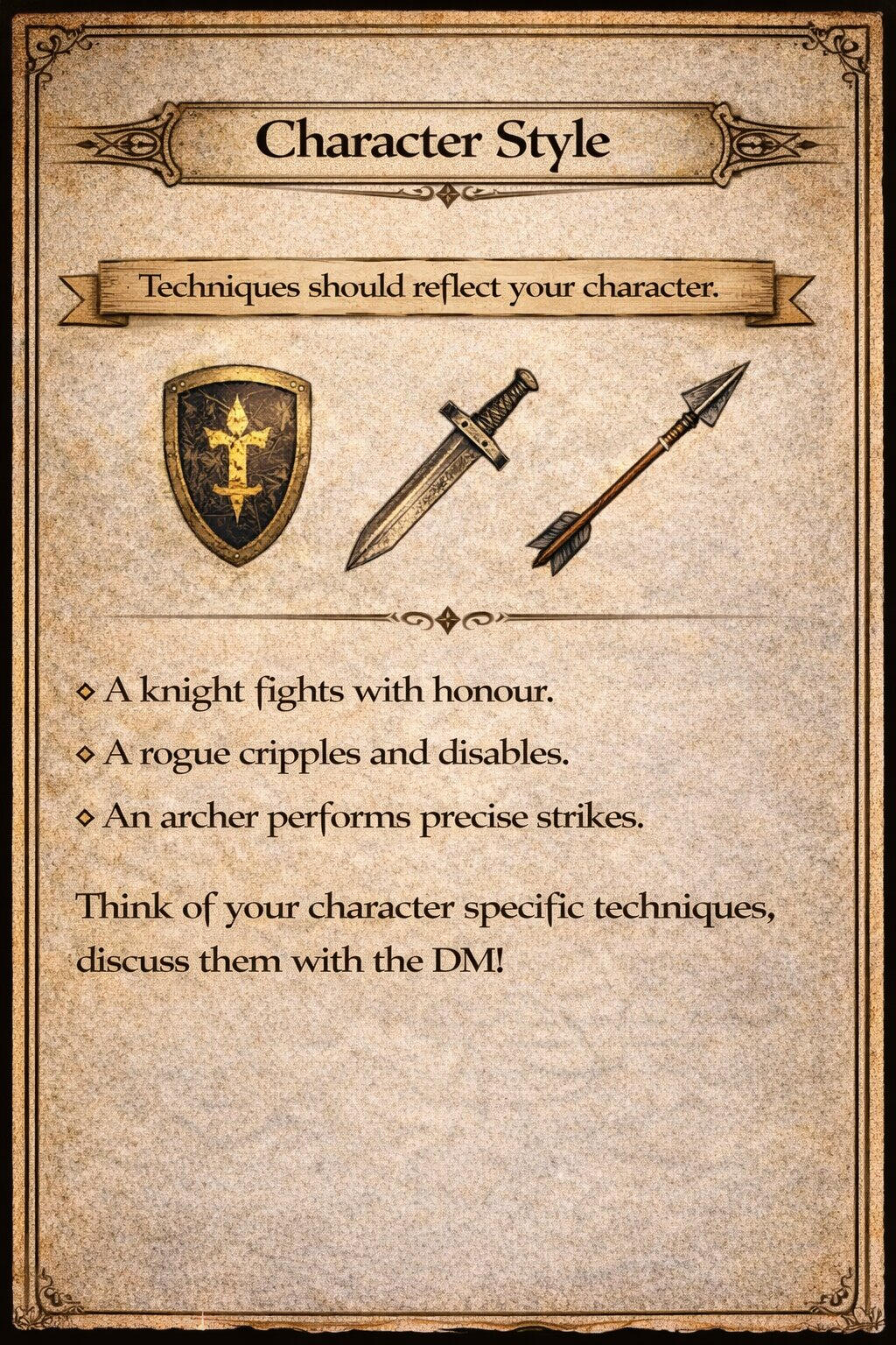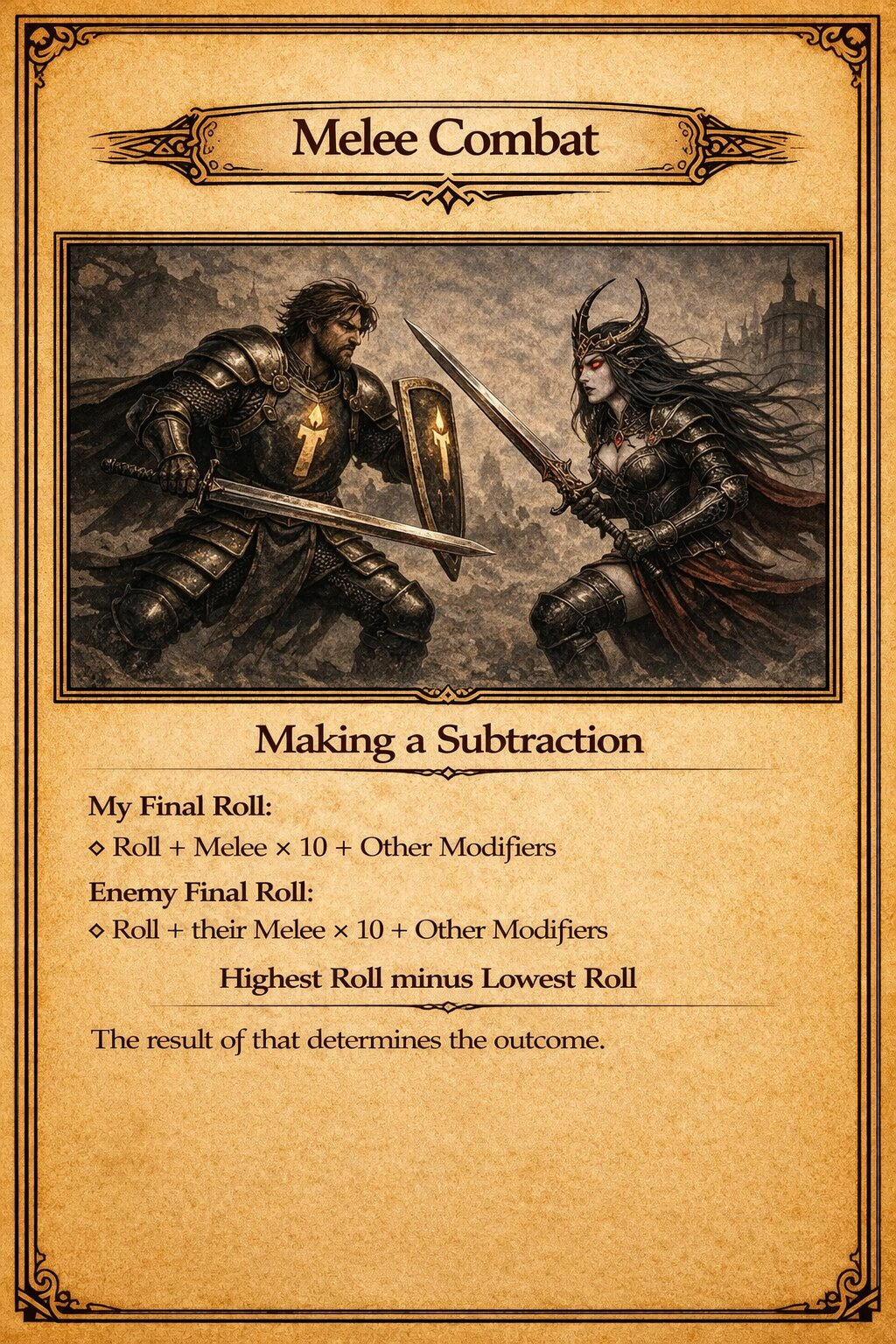The DM system provides structure to these stories. It exists to determine the consequences of your character’s actions. When uncertainty arises—whether a blade strikes true, whether a cliff is climbed, whether a spell is resisted—the dice and your character’s statistics determine the outcome.