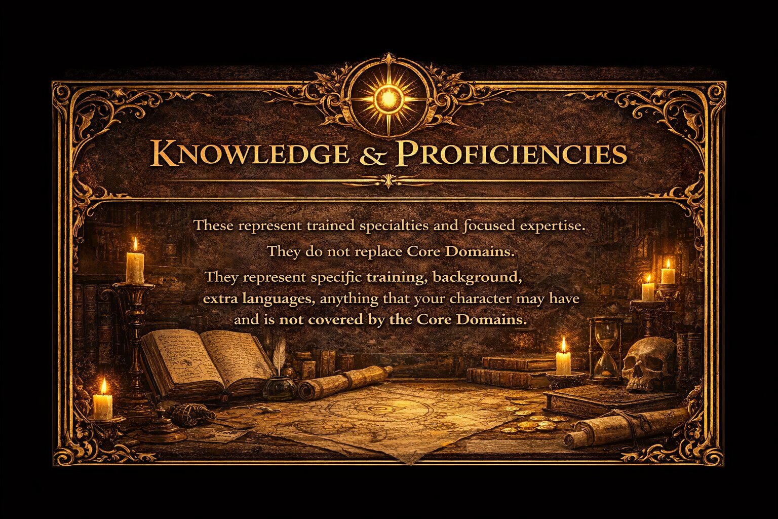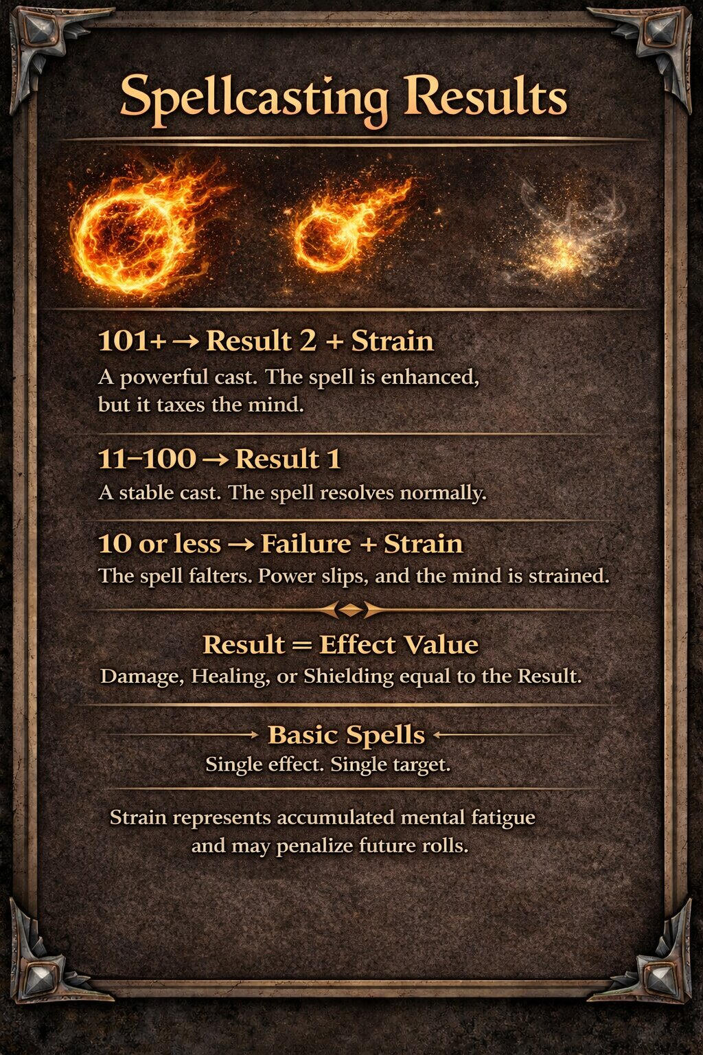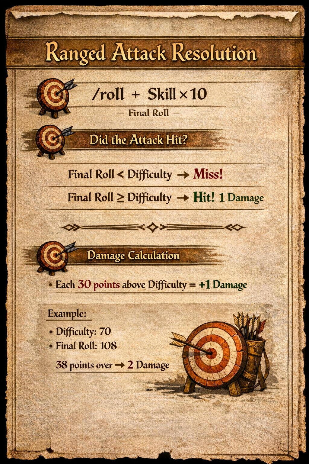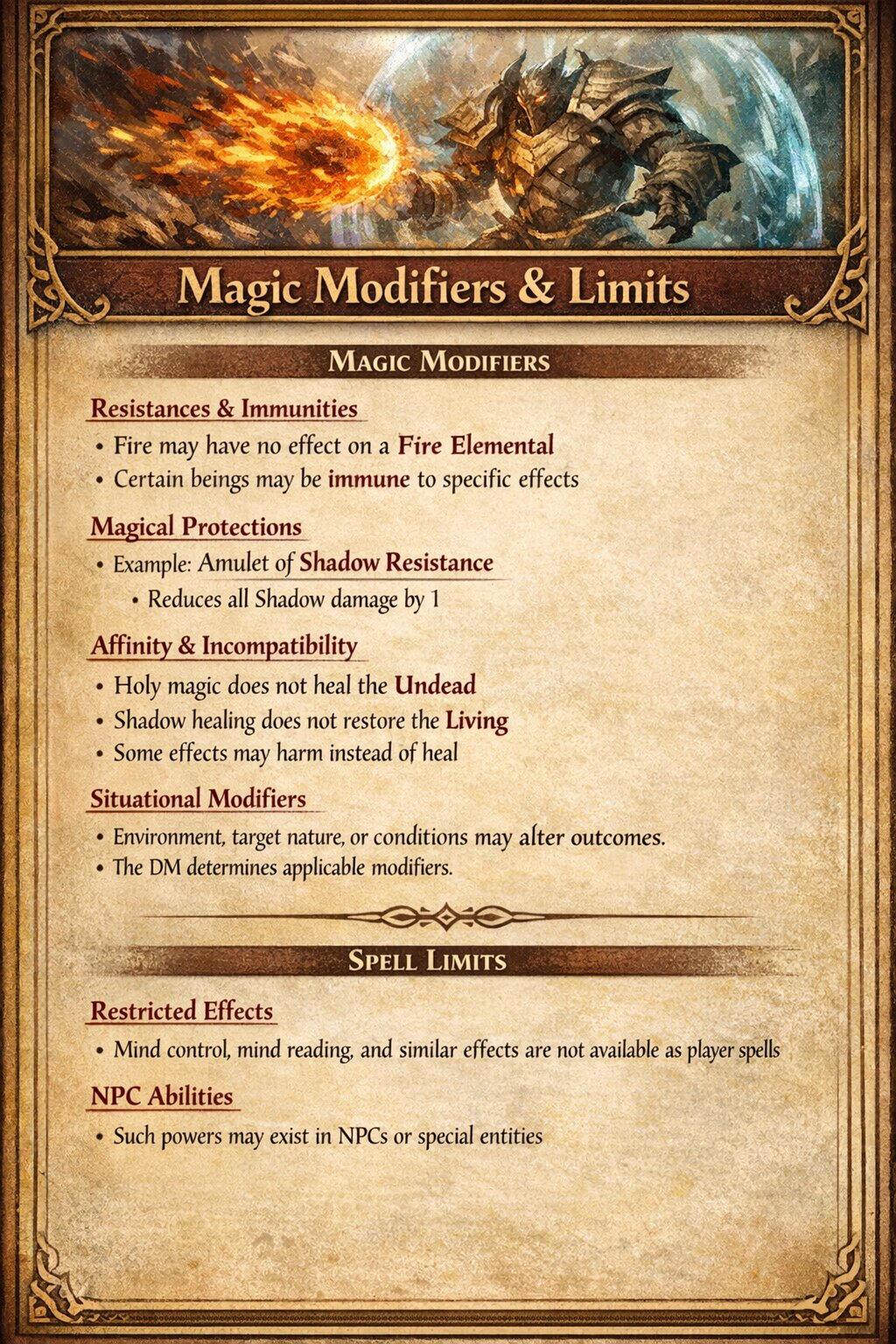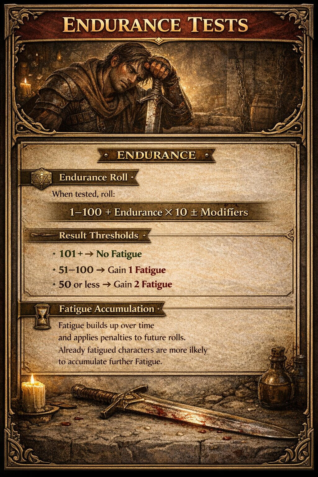 The DM system provides structure to these stories. It exists to determine the consequences of your character’s actions. When uncertainty arises—whether a blade strikes true, whether a cliff is climbed, whether a spell is resisted—the dice and your character’s statistics determine the outcome.