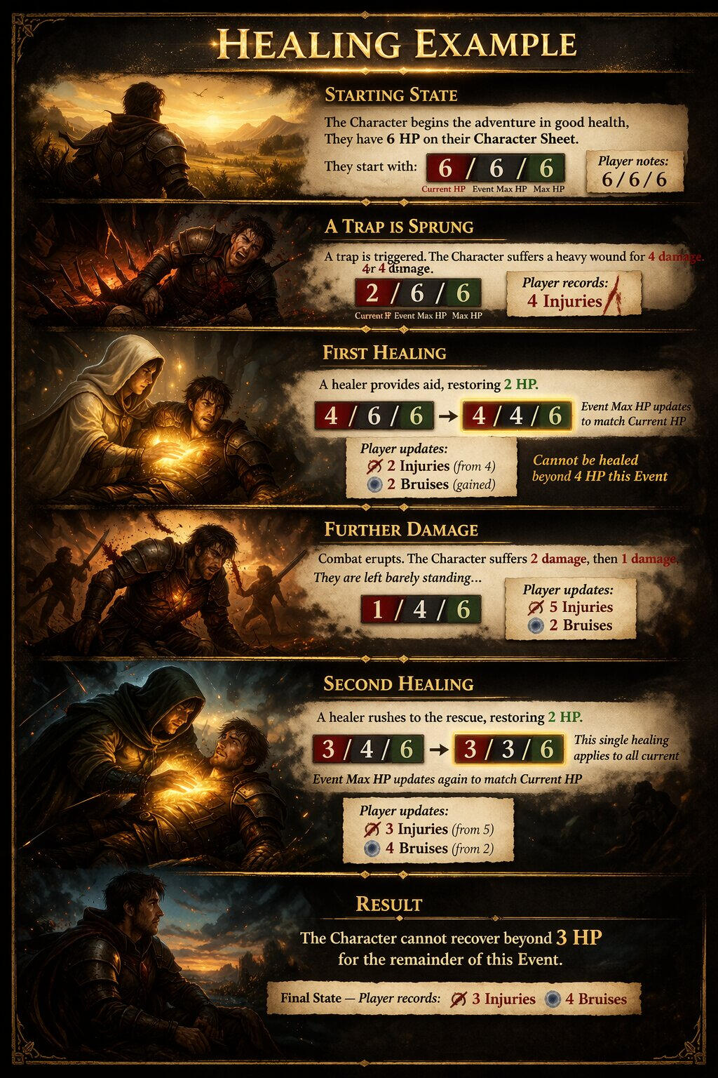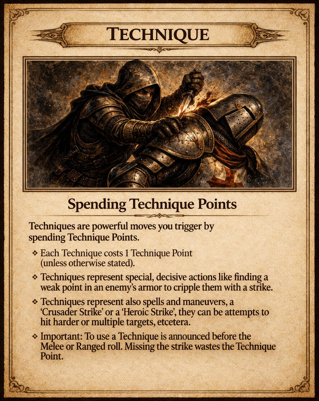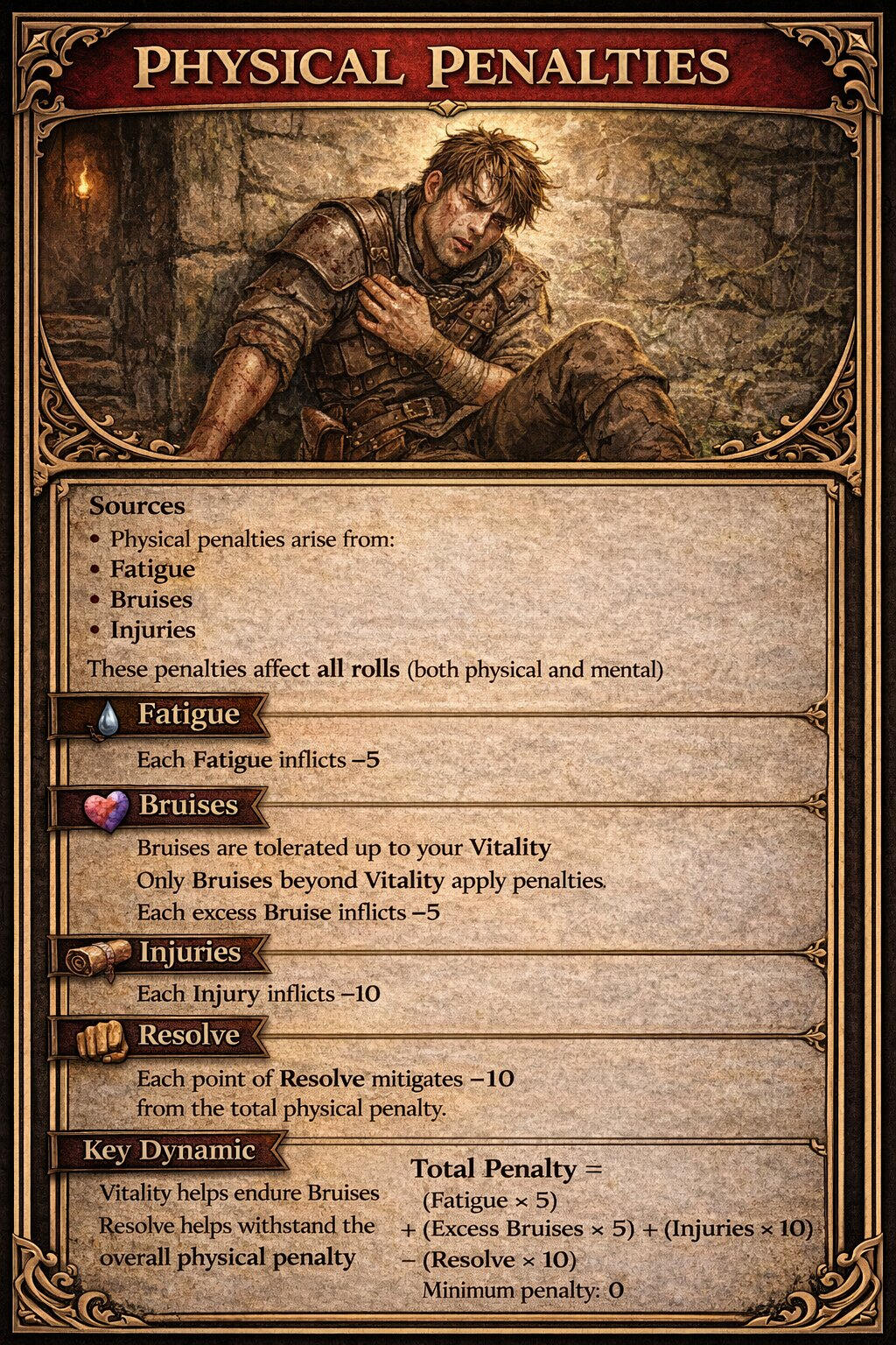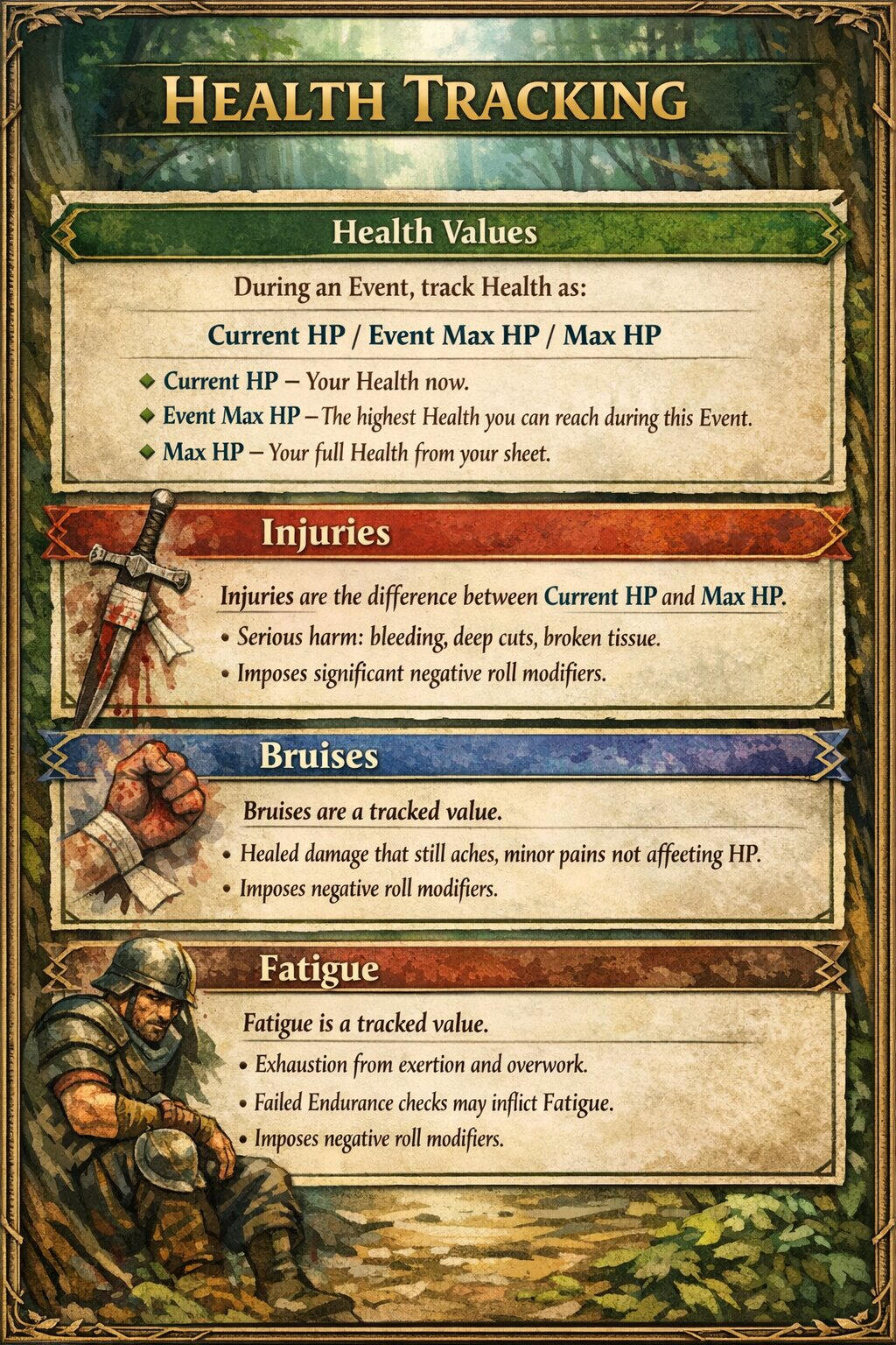 The DM system provides structure to these stories. It exists to determine the consequences of your character’s actions. When uncertainty arises—whether a blade strikes true, whether a cliff is climbed, whether a spell is resisted—the dice and your character’s statistics determine the outcome.
