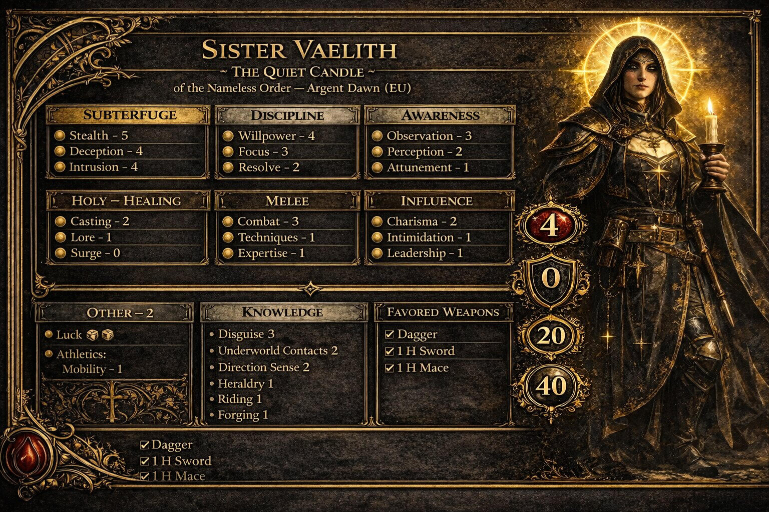 So we leave 3 DP unspent (allowed), or convert it into Luck 3? (Luck 3 total 12, not possible). But we can afford a single point in a Peripheral. Let us give Brother Thaumel a smiting capability at range too.✅ Final DP spend: 100 / 100Step C — Spend 15 KP (Knowledge/Proficiencies)