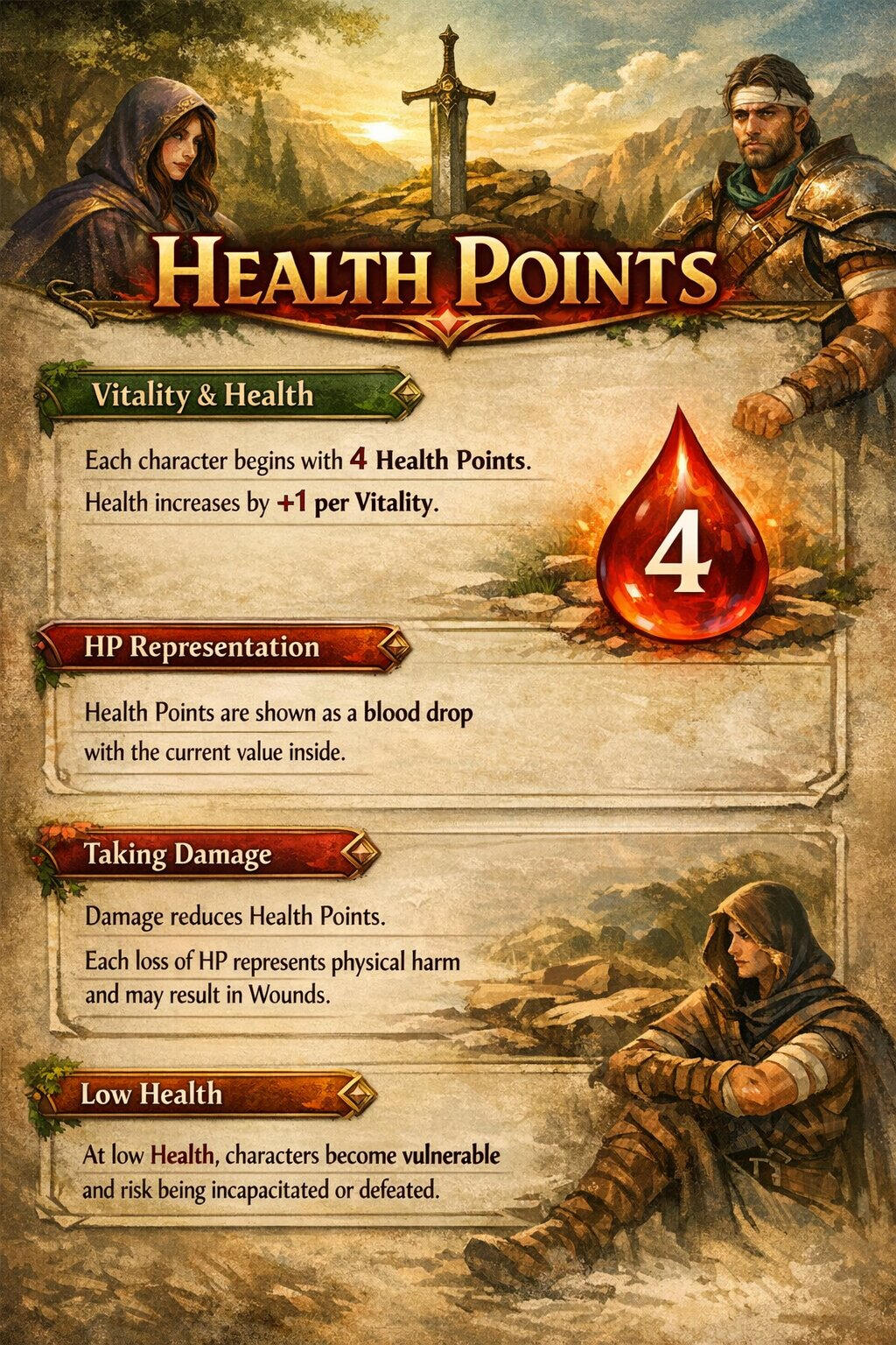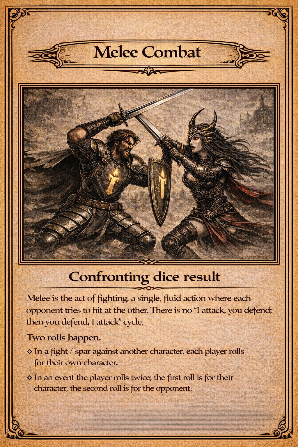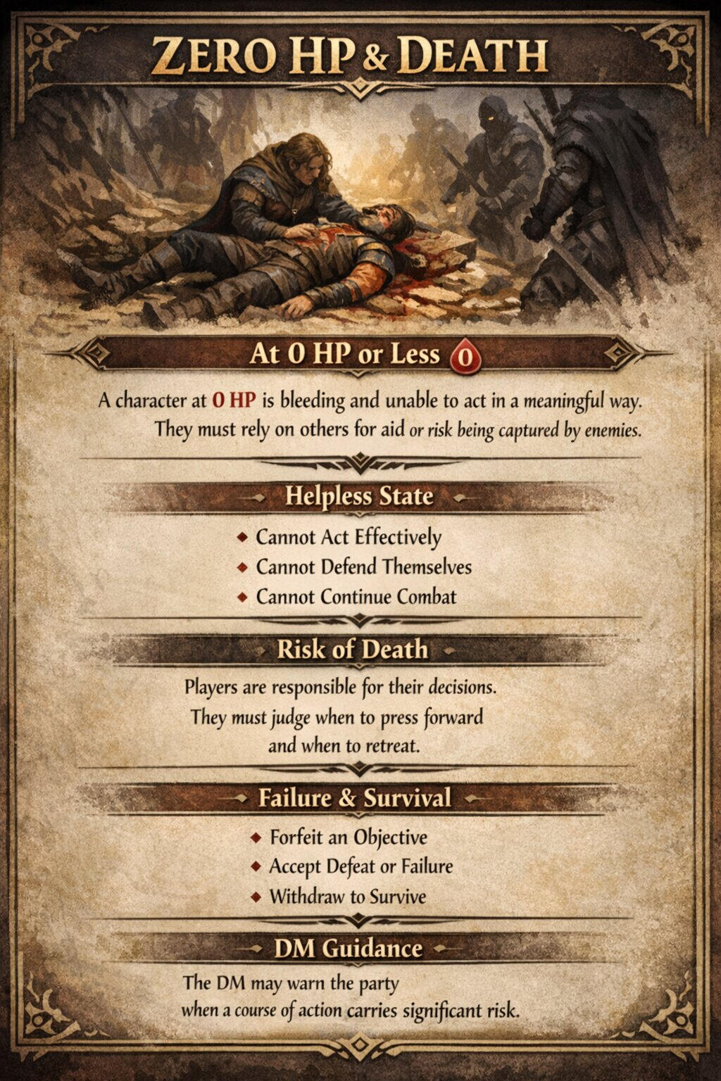The DM system provides structure to these stories. It exists to determine the consequences of your character’s actions. When uncertainty arises—whether a blade strikes true, whether a cliff is climbed, whether a spell is resisted—the dice and your character’s statistics determine the outcome.