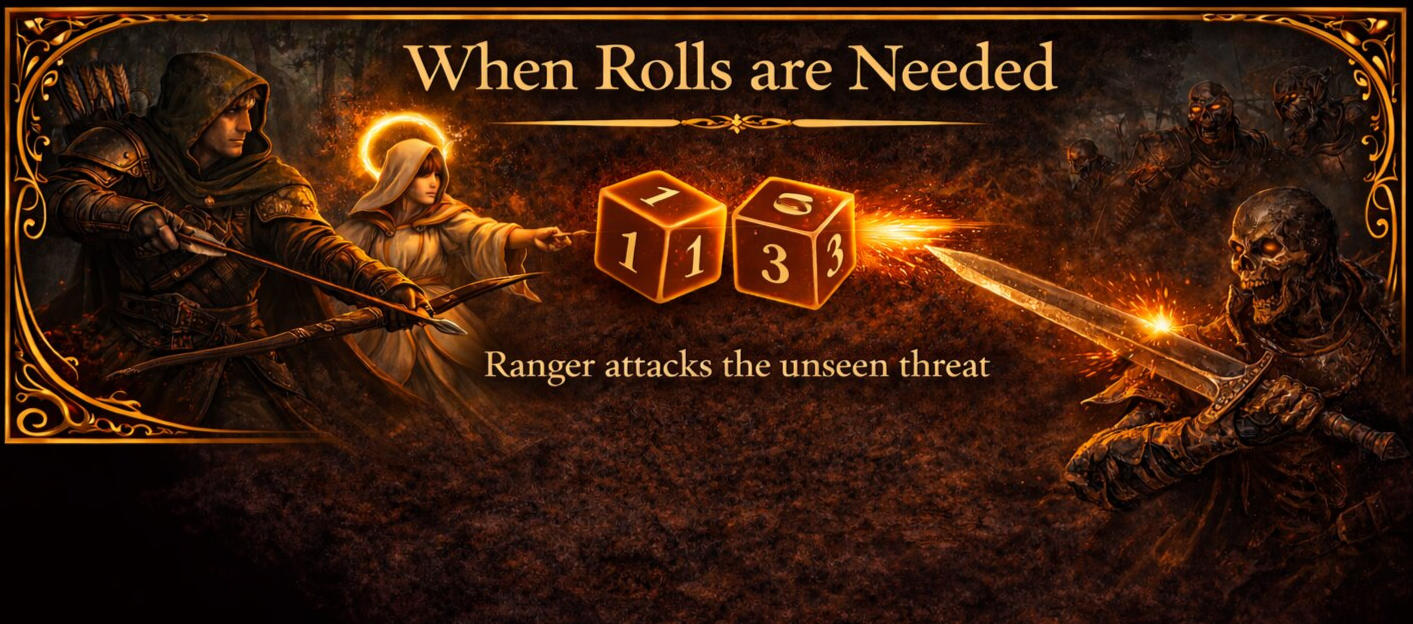 When Rolls Are CalledNot every action requires a roll.If a character has time, space, and no meaningful opposition, the Dungeon Master may simply allow the action to succeed.A modest climber can scale a tree when nothing threatens them.