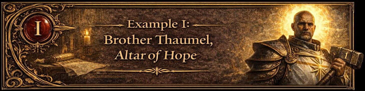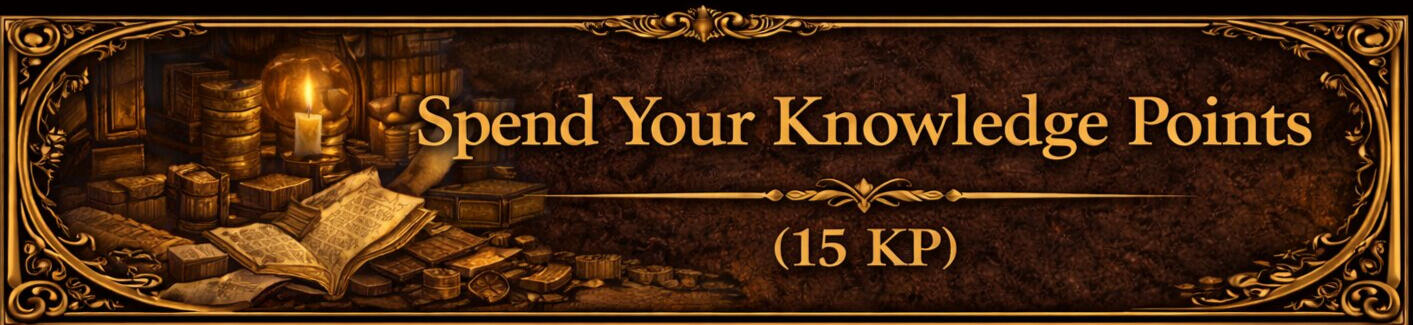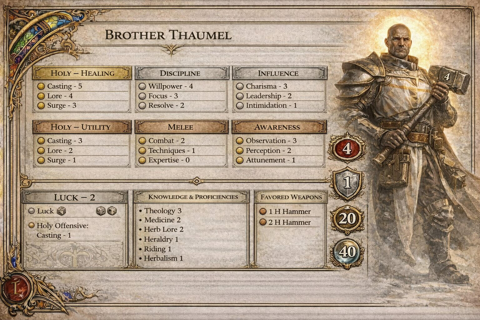 So we leave 3 DP unspent (allowed), or convert it into Luck 3? (Luck 3 total 12, not possible). But we can afford a single point in a Peripheral. Let us give Brother Thaumel a smiting capability at range too.✅ Final DP spend: 100 / 100Step C — Spend 15 KP (Knowledge/Proficiencies)